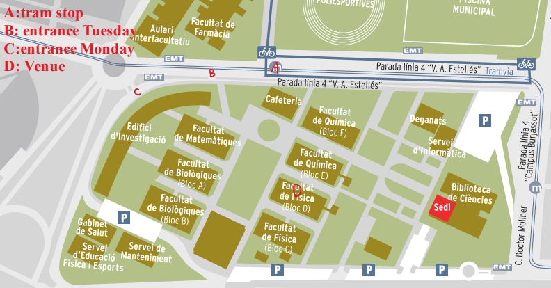 Please consult the Google Maps window at the bottom of the page. You just put 'facultad de fisica uv campus de Burjassot' in google maps and it appears there, it may appear as Dr. Moliner, 50, but it is OK, that is another entrance.